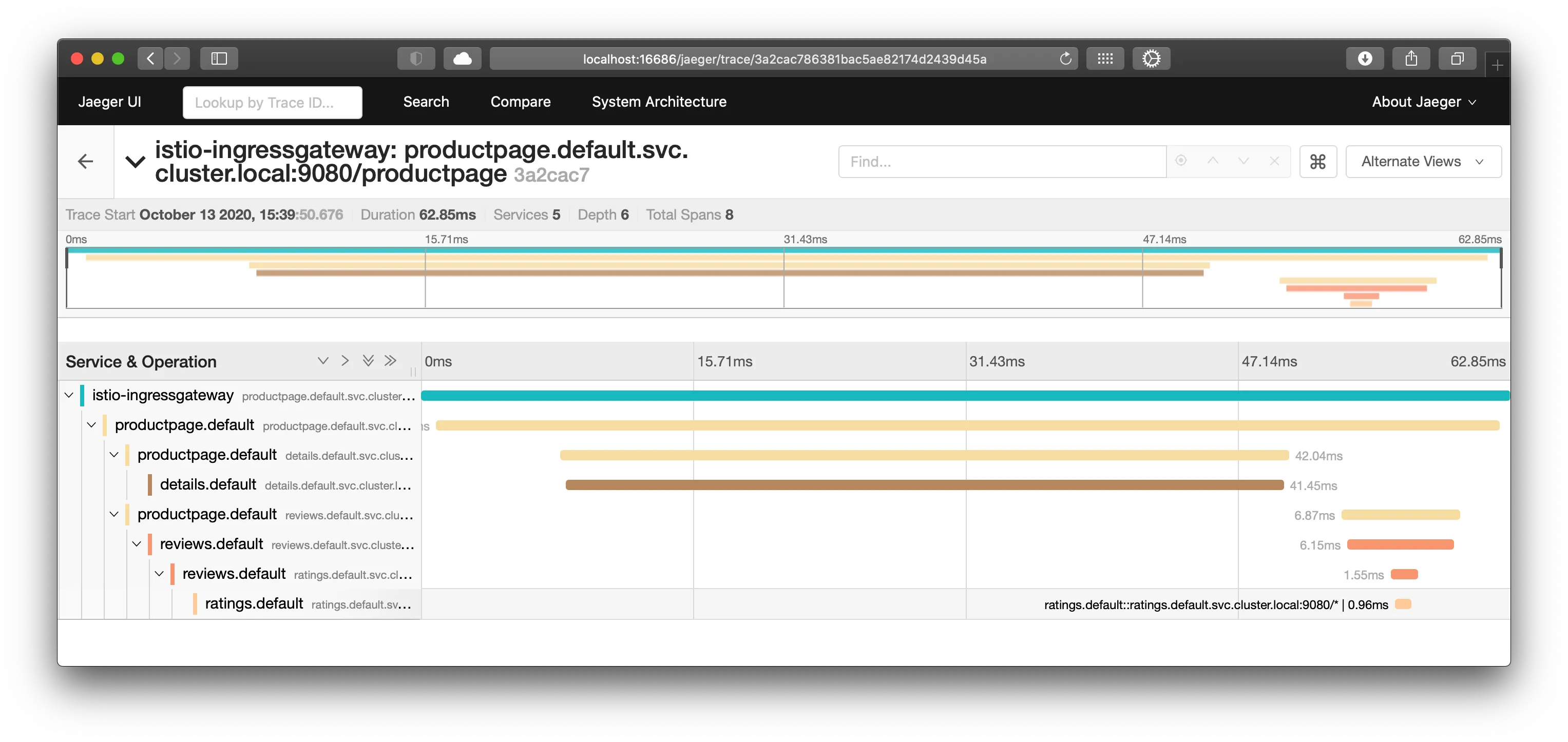 The sample Bookinfo application is configured to collect trace spans using Zipkin or Jaeger. Although Istio proxies are able to automatically send spans, it needs help from the application to tie together the entire trace. To do this applications need to propagate the appropriate HTTP headers so that when the proxies send span information to Zipkin or Jaeger, the spans can be correlated correctly into a single trace.